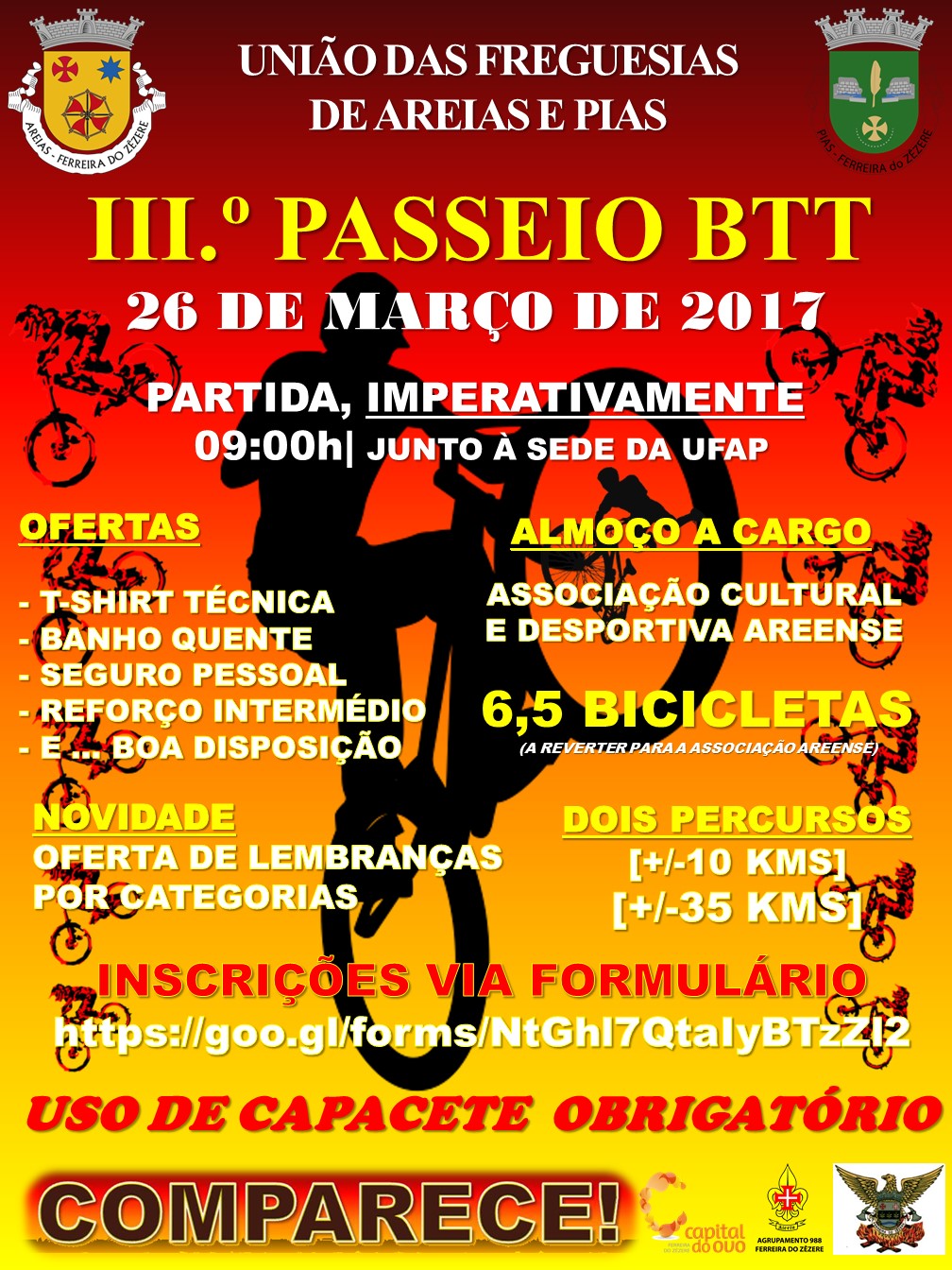É com muito gosto que lhe apresentamos o programa final do III.º Passeio de BTT a realizar-se no dia 26 de março de 2017, na área geográfica da União das Freguesias de Areias e Pias.