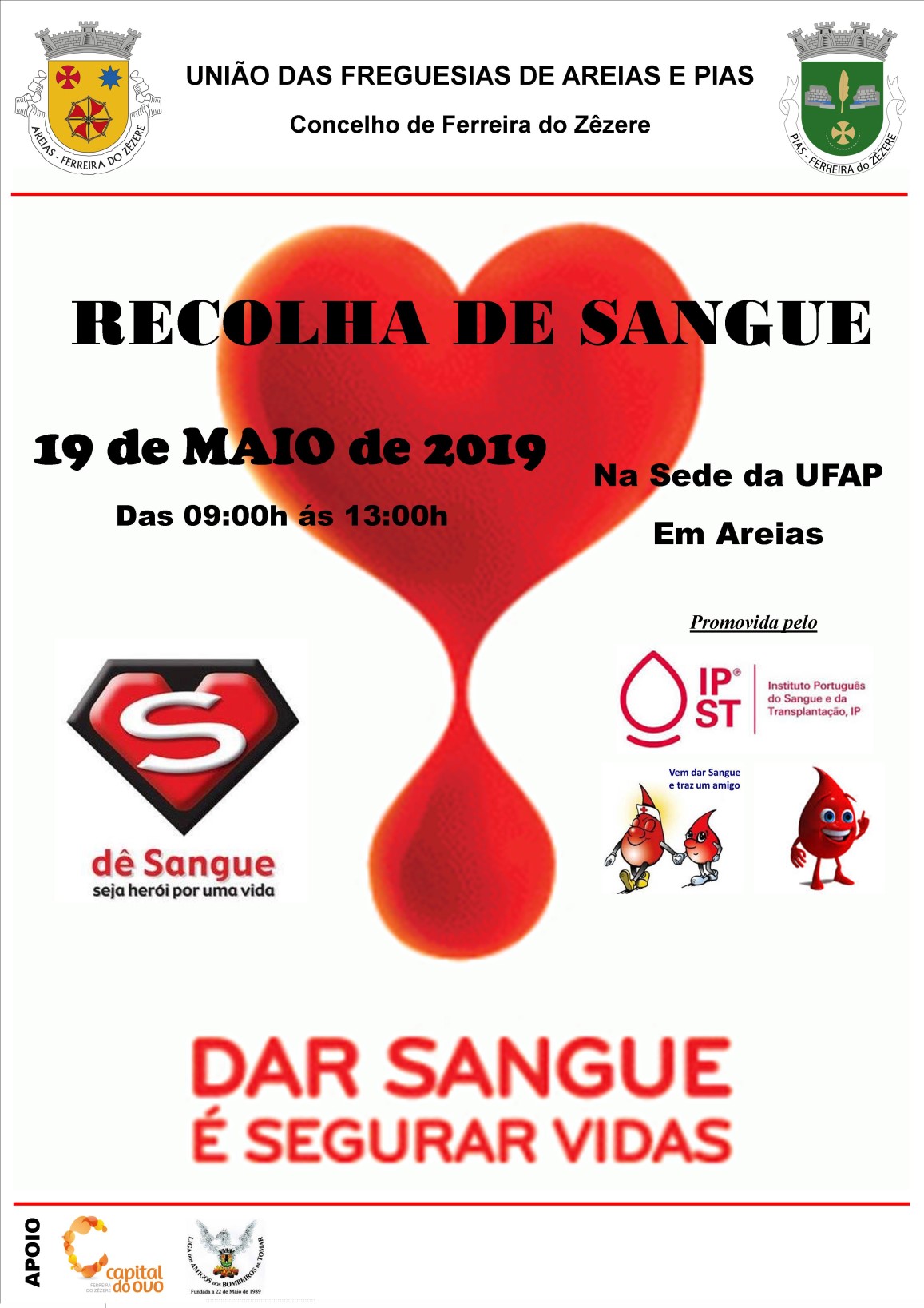 A União das Freguesias de Areias e Pias, no dia 19 de maio de 2019, vai promover uma RECOLHA DE SANGUE, a realizar na sua sede, em Areias, das 09:00h ás 13:00h.