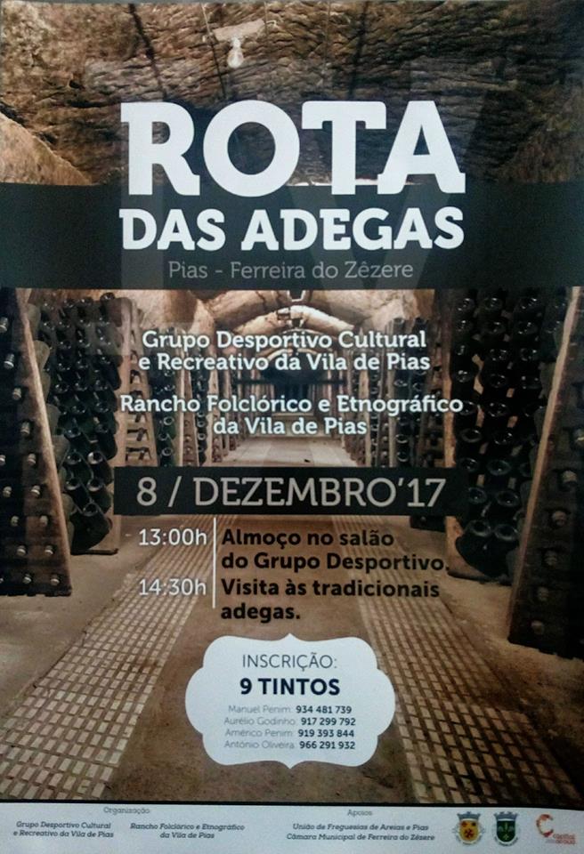 Conforme solicitado, a UFAP informa que no dia 08 de dezembro de 2017, o Grupo Desportivo, Cultural e Recreativo de Pias e o Rancho Folclórico e Etnográfico da Vila de Pias, vão realizar a IV.ª Rota das Adegas, com inicio ás 14:30h. O Evento será precedido de almoço a servir ás 13:00h na sede deste Grupo.