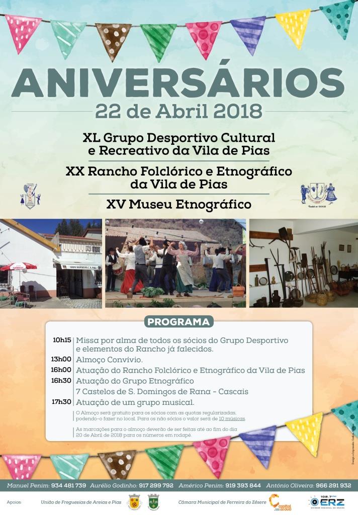Conforme solicitado, a UFAP informa que no dia 22 de abril de 2018, nas instalações do Grupo Desportivo, Cultural e Recreativo de Pias, em Pias, vai-se comemorar os seguintes aniversários: