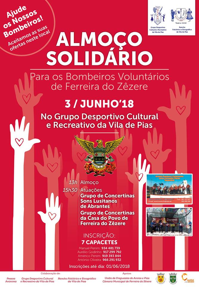Conforme solicitado, a UFAP informa que no dia 03 de junho de 2018, nas instalações do Grupo Desportivo, Cultural e Recreativo de Pias, em Pias, vai realizar-se um almoço solidário em prol da Associação Humanitária dos Bombeiros Voluntários de Ferreira do Zêzere.