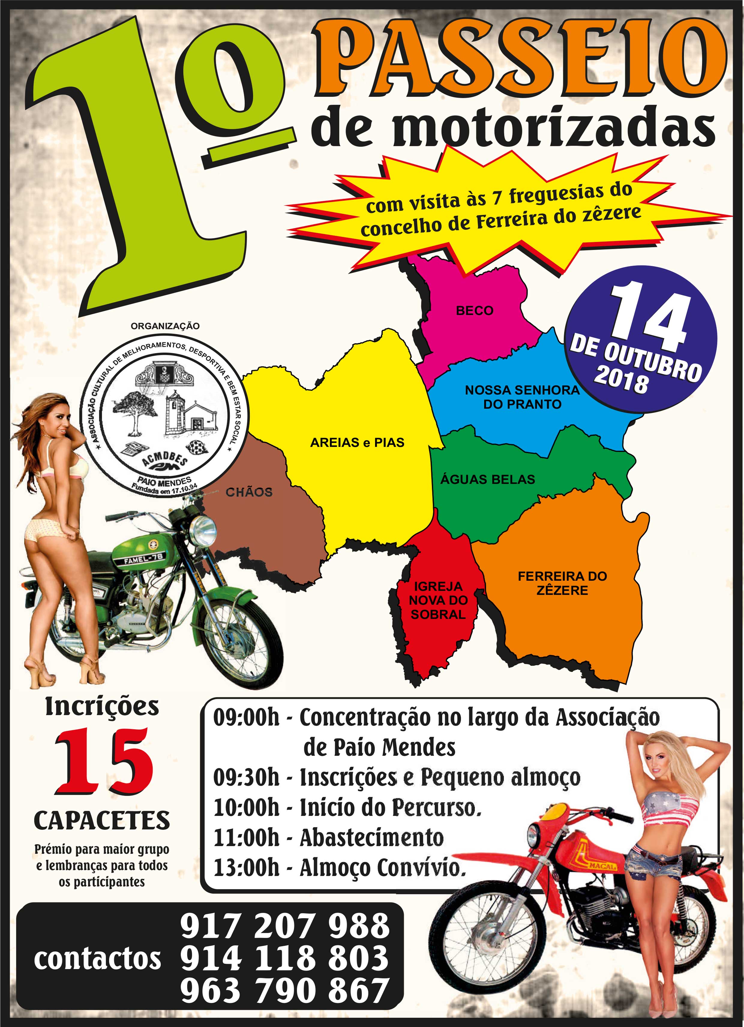 Conforme solicitado, a UFAP informa que no dia 14 de outubro de 2018, a Associação Cultural de Melhoramentos, Desportiva e Bem-Estar Social de Paio Mendes, vai realizar o seu I.ª Passeio de Motorizadas, com inicio na localidade de Paio Mendes, com passagem pelas 07 freguesias do concelho de Ferreira do Zêzere e terminando com um almoço convívio.