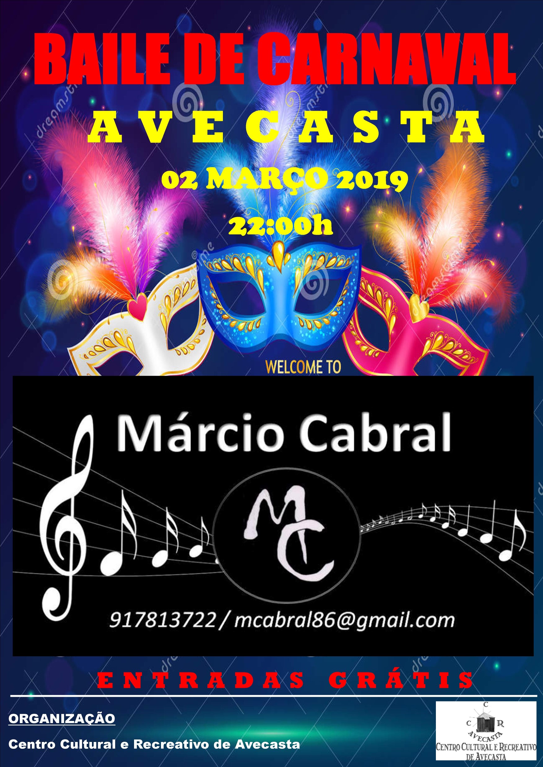 Conforme solicitado, a UFAP informa que no dia 02 de março de 2019, o Centro Cultural e Recreativo de Avecasta, vai realizar na sua sede um Grande Baile de Carnaval, com inicio ás 22:00h, com estradas grátis.
