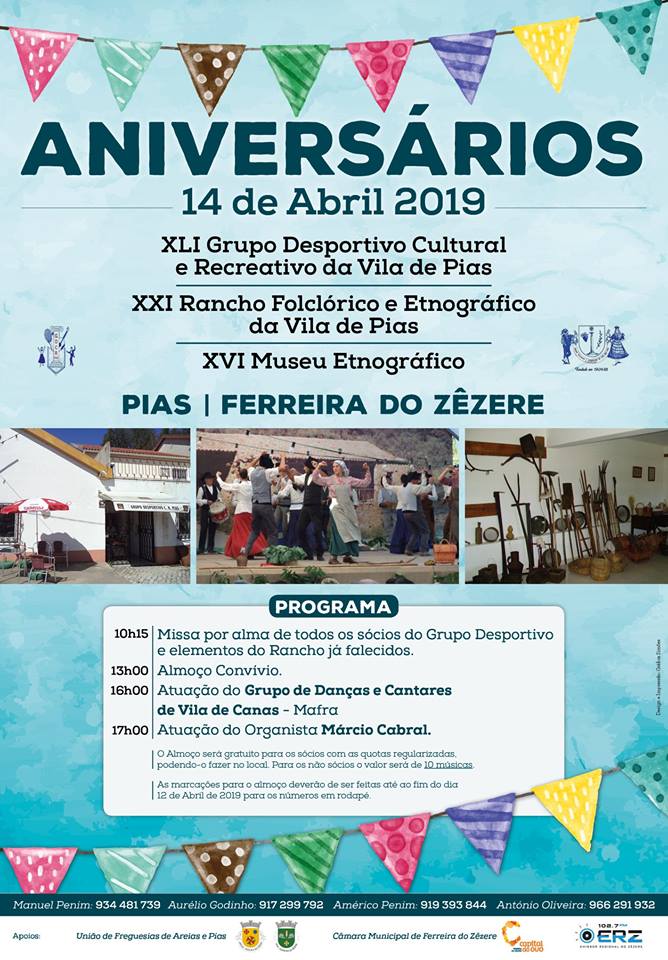 Conforme solicitado, a UFAP informa que no dia 14 de abril de 2019, nas instalações do Grupo Desportivo, Cultural e Recreativo de Pias, em Pias, vai-se comemorar os seguintes aniversários: