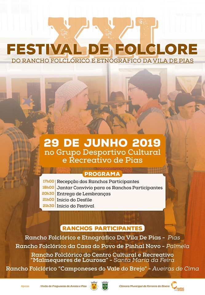 No próximo dia 29.06.2017, com início às 17:00h, vai decorrer na sede do Grupo Desportivo Cultural e Recreativo de Pias – União das Freguesias de Areias e Pias – Ferreira do Zêzere, o XXI Festival de Folclore do Rancho Folclórico e Etnográfico da Vila de Pias, cujo programa se anexa, onde se destaca o seguinte: