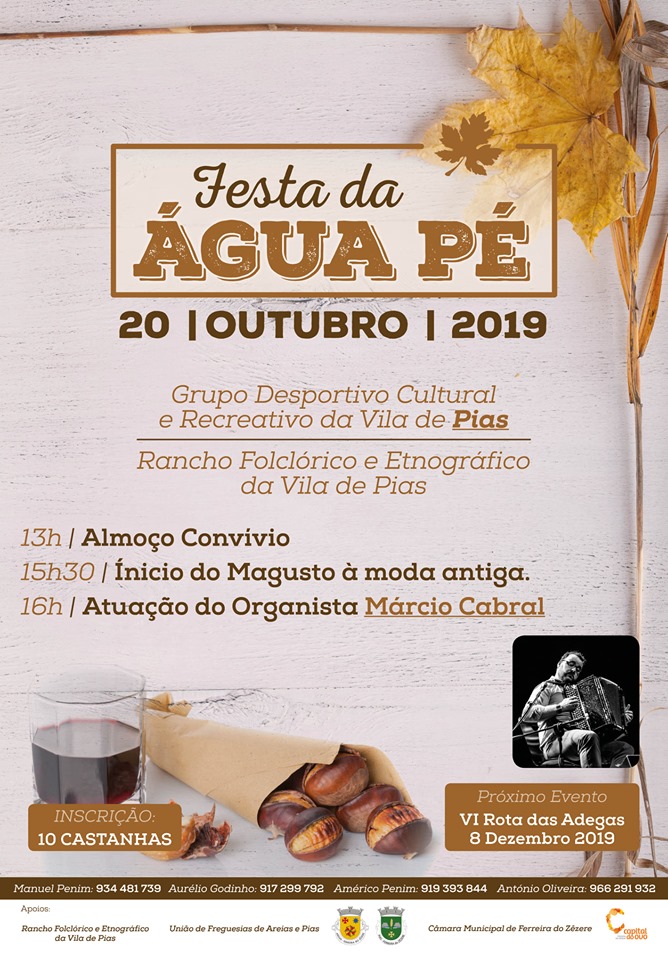 Conforme solicitado, a UFAP informa que no dia 20 de outubro de 2019, o Grupo Desportivo, Cultural e Recreativo de Pias e o Rancho Folclórico e Etnográfico da Vila de Pias, vão realizar a Festa da Água-Pé, na sede do centro.