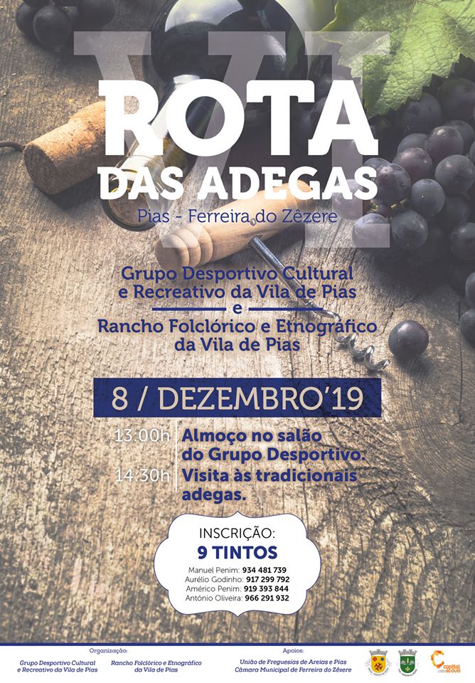 Conforme solicitado, a UFAP informa que no dia 08 de dezembro de 2019, o Grupo Desportivo, Cultural e Recreativo de Pias e o Rancho Folclórico e Etnográfico da Vila de Pias, vão realizar a VI.ª Rota das Adegas, com inicio ás 14:30h. O Evento será precedido de almoço a servir ás 13:00h na sede deste Grupo.